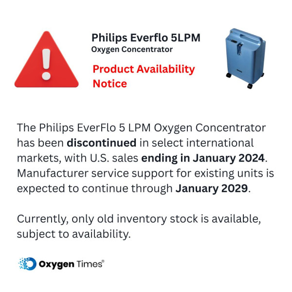 The Philips EverFlo 5 LPM Oxygen Concentrator has been discontinued in select international markets, with U.S. sales ending in January 2024. Manufacturer service support for existing units is expected to continue through January 2029.